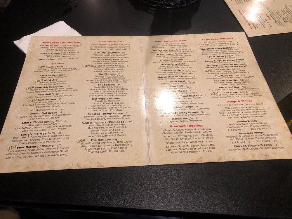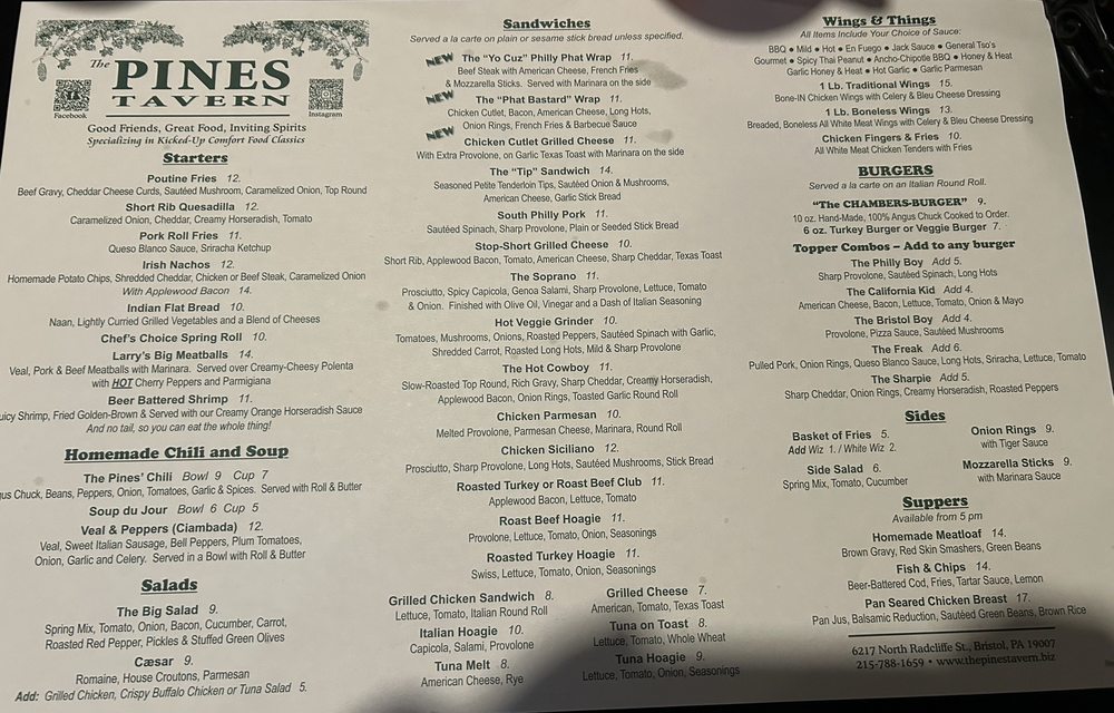 Welcome to The Pines Tavern, a cozy gem in Bristol, PA, where New American cuisine meets bar culture. Nestled at 6217 N Radcliffe St, this tavern offers a diverse menu that caters to every palate. Renowned for its signature Soprano Sandwich, filled with prosciutto, spicy capicola, and sharp provolone, it perfectly embodies the vibrant Italian flavors that patrons rave about.